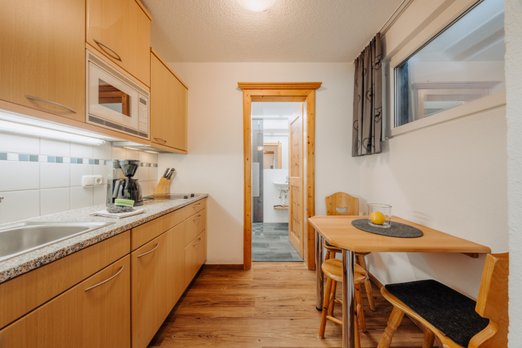 • Küchenzeile mit Essbereich, Kühlschrank, Cerankochfeld, Kaffeemaschine, Toaster, Wasserkocher, Mikrowelle, Geschirrtücher