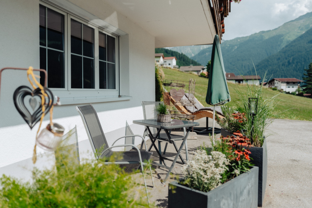 • sonnige Terrasse mit Gartengarnituren